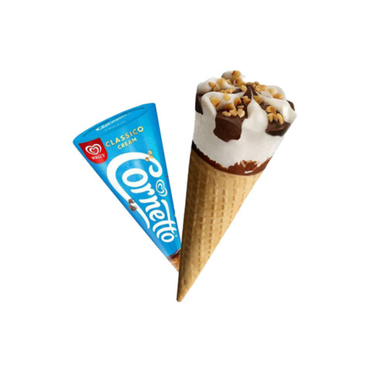 Le cornet glacé iconique : une crème onctueuse à la vanille, un enrobage chocolat croquant et des éclats de noisettes dans un cône croustillant.